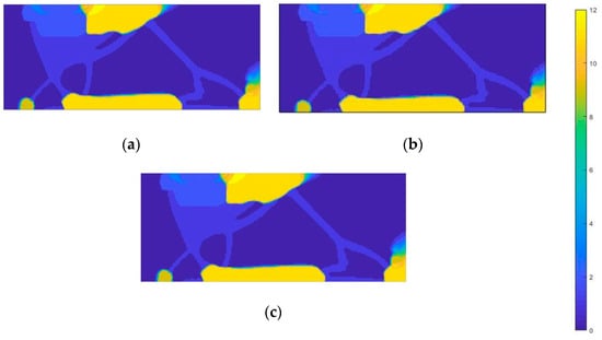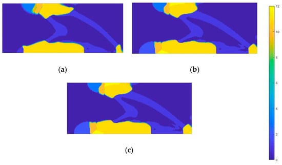 Material distribution map for the third load case—mid-stance phase (materials 1–5: auxetic materials, material 6–11: conventional materials): (a) onyx; (b) nylon 12; (c) steel.