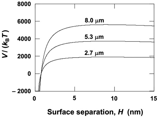 The potential energy between particle surfaces was calculated to analyze the dispersion state of colloidal particles in water. According to DLVO theory [7,8], the potential energy is expressed as: