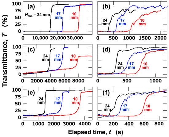 Changes in transmittance of PMMA aqueous dispersions at 25 °C. (a,b) dPMMA = 2.7 μm, (c,d) 5.3 μm, (e,f) 8.0 μm. (a,c,e) No electric field; (b,d,f) E = 0.5 V/mm DC.