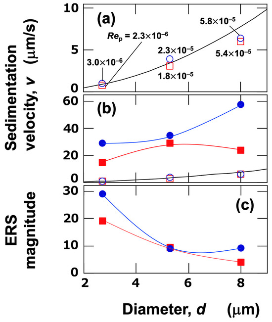 Effect of particle size on sedimentation velocity and the magnitude of the ERS Effect at 25 °C. (a) Sedimentation velocity under no electric field. Solid line: theoretical values based on Stokes’ approximation; numbers: particle Reynolds number (Rep). (b) Sedimentation velocity under an electric field (E = 0.5 V/mm DC), with comparative data from (a). (c) The magnitude of the ERS effect. Blue circles: upper region (Hobs = 17–24 mm); red squares: lower region (Hobs = 10–17 mm). Open symbols represent data under no electric field, and closed symbols represent data under an electric field.