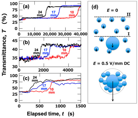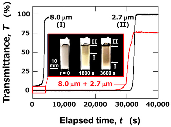 Next, the ERS effect in aqueous dispersions of mixed-sized PMMA particles was investigated. In the mixed aqueous dispersions of large particles (dPMMA = 8.0 μm) and small particles (dPMMA = 2.7 μm), the transmittance under no electric field exhibited a sharp increase around the elapsed time, t = 30,000 s (Figure 4). This timing closely corresponds to the increase observed in the aqueous dispersion of large particles, suggesting that the change in transmittance was primarily due to the sedimentation of large particles. The cell used for the transmittance measurement was photographed from the side (images within Figure 4). Since the dispersion was quite turbid, the brightness, contrast, and sharpness of the images were adjusted from the originals for better visibility. From the images, it was evident that the particles were uniformly dispersed throughout the dispersion immediately after resting (t = 0). At t = 1800 s, two interfaces (I and II) were relatively clearly observed with the naked eye. Interface (I) corresponded to the sedimentation of large particles, while interface (II) was due to the sedimentation of small particles. As time progressed (t = 3600 s), the two interfaces were seen to descend independently. Although the two interfaces could be observed with the naked eye, the transmittance changes only reflect interface (II), which is associated with the sedimentation of small particles. This was likely due to the high particle concentration in the dispersion, which caused significant turbidity, obscuring interface (I) in the transmittance measurements.