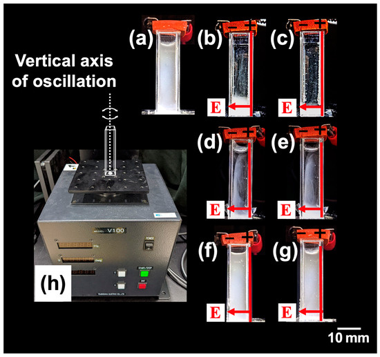 The visual appearance of PMMA aqueous dispersions on a horizontally oscillating platform at 25 °C. App = 1.6 deg. (a) No electric field immediately after resting; (b–g) E = 0.5 V/mm DC; (b,d,f) t = 900 s; (c,e,g) t = 1800 s. (b,c) f = 1.0 Hz; (d,e) f = 6.0 Hz; (f,g) f = 20 Hz. (h) Vibration apparatus with a horizontally oscillating platform with a vertical rotational axis.