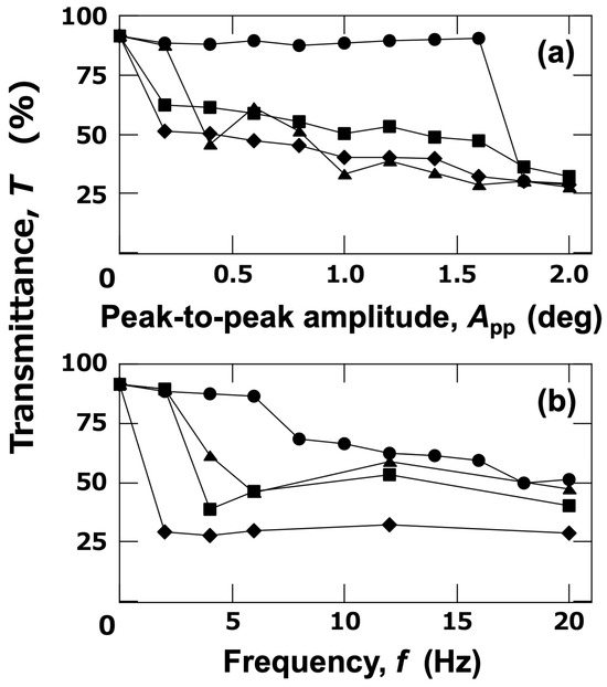 Effect of (a) App and (b) f on transmittance of PMMA aqueous dispersions at 25 °C. Central point between electrodes; Hobs = 27 mm. (a) : f = 2.0 Hz; ▲: 4.0 Hz; ■: 12 Hz; ◆: 20 Hz. (b) : App = 0.2 deg; ▲: 0.6 deg; ■: 1.2 deg; ◆: 2.0 deg. The solid lines connecting the data points are for better visibility.