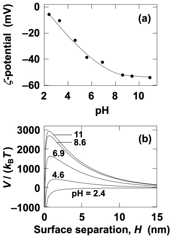 Effect of pH on (a) ζ-potential and (b) DLVO potential energy curves for silica particles in water at 25 °C. c = 4.0 × 10–3 mol/L; LD = 4.8 nm; AH = 3.0 × 10–20 J. Ψ0 was replaced with the ζ-potential. The solid line in (a) is provided to make the changes in ζ-potential easier to observe.