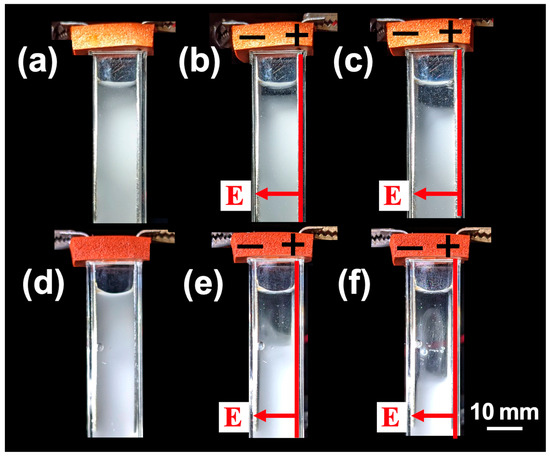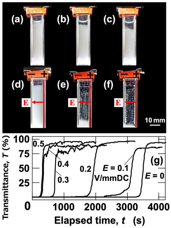 For the particle volume fraction used in this section (ϕ = 1.0 × 10–4), Lcc was calculated to be 48.7 μm, indicating that particles were significantly separated. Therefore, even at pH = 2.4, the likelihood of particle contact and floc formation under no electric field is low. It is also noteworthy that discrepancies between DLVO theory and experimental results for silica particles have been recognized for a long time. Specifically, an additional repulsive force not accounted for in DLVO theory must be considered for silica particles. This additional repulsion is thought to arise from polymer chains on the silica particle surfaces [17]. In summary, even at pH = 2.4, the likelihood of silica particles forming flocs is low. To confirm the manifestation of the ERS effect in aqueous dispersions of silica particles, sedimentation behavior under no electric field and with an applied electric field was observed (Figure 9a–f). Under no electric field, the slow descent of the interface between the water phase and the colloid-rich phase, associated with the sedimentation of silica particles, was observed (Figure 9a–c). Even after t = 3600 s, the interface remained in the upper region of the cell. In contrast, with an applied electric field (E = 0.5 V/mm DC), almost all the particles appeared to have sedimented to the bottom of the cell within t = 1800 s (Figure 9d–f). While the descent of the interface under the electric field was faster than under no electric field, it maintained an almost “horizontal” state, similar to the behavior observed under no electric field. This trend was also observed in the ERS effect of PMMA particle dispersions and other particle dispersions discussed earlier. Transmittance measurements at an observation height of Hobs = 27 mm were conducted (Figure 9g). Under no electric field, the increase in transmittance was observed at the latest time point, whereas with increasing electric field strength, the increase was observed at earlier time points. The timing of the transmittance increase converged around E = 0.5 V/mm DC. These results confirmed that the ERS effect also occurs in aqueous dispersions of silica particles.