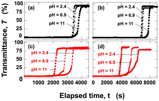 The time-dependent transmittance of silica particle aqueous dispersions was measured at Hobs = 27 mm (Figure 10a,c) and Hobs = 17 mm (Figure 10b,d) for pH = 2.4, 6.9, and 11. Under no electric field (Figure 10a,b), the earliest transmittance increase was observed at pH = 2.4, followed by pH = 6.9, and then pH = 11. This indicates that the sedimentation velocity of individual silica particles was highest at pH = 2.4, followed by pH = 6.9, and lowest at pH = 11. Considering that the particles are sedimented individually, the pH-dependent sedimentation velocity is likely attributable to the influence of the electric double layer surrounding the silica particles. At higher pH levels, the absolute value of the ζ-potential is larger, suggesting that the hydrodynamic size of the particles increases with pH. As the hydrodynamic size increases, the fluid resistance during sedimentation also increases, resulting in a corresponding reduction in the terminal sedimentation velocity. Silica particles are more resistant to pH changes compared to PMMA particles; however, under alkaline conditions, particularly at pH = 11, there is a possibility that the silica particles slightly dissolve [18], reducing their particle size within the experimental timeframe of up to approximately 3 h. Despite this potential dissolution of the surface layer, it is remarkable that the silica dispersions exhibited the highest sedimentation velocity under the application of an electric field during this period. In contrast, under an applied electric field (Figure 10c,d), the earliest transmittance increase was observed at pH = 11, followed by pH = 6.9, and lastly, pH = 2.4, a trend opposite to that observed under no electric field. The significant increase in sedimentation velocity under the electric field strongly suggests that silica particles formed flocs. The pH dependence of the sedimentation velocity of silica particles under the electric field was observed (Figure 11). The descent velocity of the interface was clearly the fastest at pH = 11. At pH = 2.4, the interface remained almost horizontal, whereas at pH = 11, the interface appeared more disturbed. At pH = 11, the development of the electric double layer may have induced more complex interfacial electrokinetic phenomena.