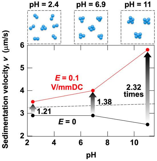 Effect of pH on sedimentation velocity of silica particles in water at 25 °C. ϕSi = 1.0 × 10–4. The central point between electrodes. Calculated from the time difference at which transmittance reached 50% at Hobs = 27 mm and 17 mm. Black circles: E = 0; red circles: E = 0.1 V/mm DC; dashed line: sedimentation velocity under no electric field calculated using Stokes’ law. The solid lines connecting the data points are for better visibility. The arrows indicate the rate of increase in sedimentation velocity. Schematic diagrams at the top represent aggregates at each pH, with particle number density significantly exaggerated for clarity.