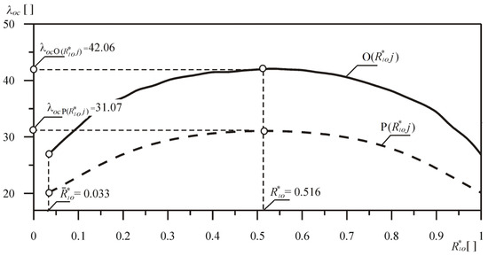 In the considered case of external load, numerical computation was performed to obtain the maximum of the critical force Pkr of the systems, taking into account the transcendental equation for the critical value (see Formula (32)). It was assumed that the numerical calculations carried out with the division of the rod into n = 128 parts are sufficiently accurate. In order to validate the obtained results, the values of the buckling load of the system O(R1o*j) and the parameters of the loading system were referred to the constant length of the column L and the bending stiffness (EJ)p of the relative system P(R1o*j).