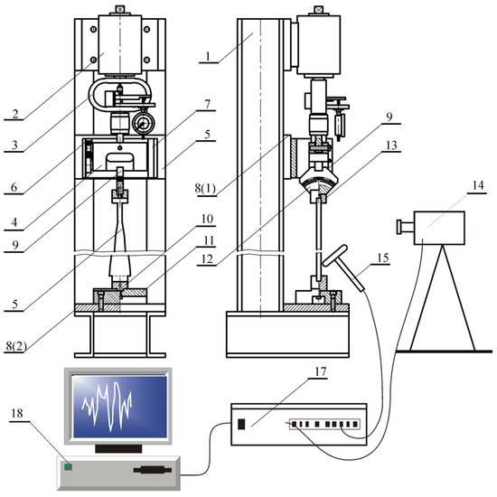 Figure 8. The element of the head (2) is attached to a support frame (1) and is a screw system where the force loading the column under consideration (5) is generated by the dynamometer (3) and a plate (4). The required boundary conditions of the column are implemented by supports attached to plates 8 (1) and 8 (2). A linear feed in the rails (7) attached to plate 8 (1) is ensured through bearings (6) used at the pivots of the base (4). The boundary conditions at the free end are guaranteed by a loading head (9) attached to the plate (4). The component (1) that is mounted to the base 8 (2) with the housing (11) ensures the condition of rigid bracing of the system. The head receiving the external force (12) is mounted to the rod under consideration with the use of block (13). It is assumed that the parts of the structure receiving external load, (12), (13), and (6), are infinitely rigid, which is dictated by construction considerations.