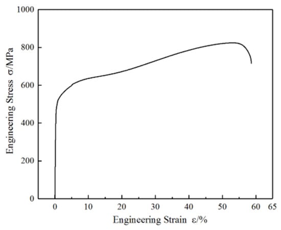 The relationship between engineering stress and strain of the experimental steel was measured, as shown in Figure 1. The yield strength of the experimental steel is 481.8 MPa, the tensile strength is 824.6 MPa, the fracture elongation is 58.7%, the elastic modulus is 226.1 GPa, there is no yield platform, and the yield strain is about 0.5%. In comparison with conventional duplex stainless steels, the experimental Mn–N alloyed duplex stainless steel demonstrates significantly enhanced mechanical properties, particularly in terms of elastic modulus and elongation. This improvement can be primarily attributed to the transformation-induced plasticity (TRIP) effect derived from the presence of metastable austenite in the alloy. Specifically, by replacing costly Ni with Mn and N, the stability of the austenite phase is intentionally reduced, rendering it metastable under mechanical loading. During cyclic deformation, this metastable austenite undergoes stress- or strain-induced martensitic transformation, which activates the TRIP effect. The progressive transformation enhances strain hardening and delays necking, thereby improving both ductility and the work hardening rate. Furthermore, nitrogen contributes to solid solution strengthening and promotes grain refinement, while manganese facilitates the formation of a finer austenitic structure and increases the driving force for martensitic transformation. Collectively, these factors synergistically result in the observed increase in elastic modulus and elongation compared to conventional duplex stainless steels. With the increase in deformation, the engineering stress–strain curve shows an obvious secondary increase. The work hardening rate curve first decreases, then increases to the peak and then decreases again, showing the “three-stage” hardening characteristics. It can be inferred from this that the metastable austenite phase in the test steel underwent deformation-induced martensitic transformation during the deformation process, generating the TRIP effect.