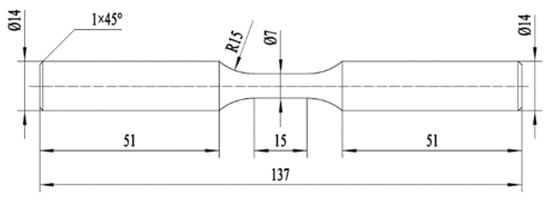 The experimental steel specimen with a circular section used for the cyclic loading test is shown in Figure 2 concerning ASTM E606/E606M-2012 [35].