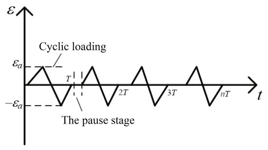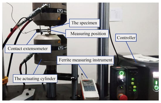 The Fischer FMP30 ferrite measuring instrument (Nantong Fischer Testing Instrument Co., Ltd., Nantong, China) is used to accurately measure the transformation of martensite by measuring the volume fraction of the ferromagnet, that is the body-centered cubic (BCC) structure. In this study, the Fischer FMP30 ferrite measuring instrument and Instron 8801 series servo-hydraulic testing machine (Shanghai Instron Test Equipment Trading Co., Ltd., Shanghai, China) are combined to build an in situ measurement platform for measuring the transformation of martensite under cyclic loading. By reasonably compiling the cyclic loading control program of the servo-hydraulic testing machine, the ferrite measuring instrument can be used to measure the volume fraction of martensite many times in given cycles. The in situ measurement platform for martensitic transformation is shown in Figure 3. The loading control path of the servo-hydraulic testing machine is shown in Figure 4. The loading control path is divided into two periods, namely the cyclic loading stage and the pause stage (the stage for measuring the volume fraction of strain-induced martensite).