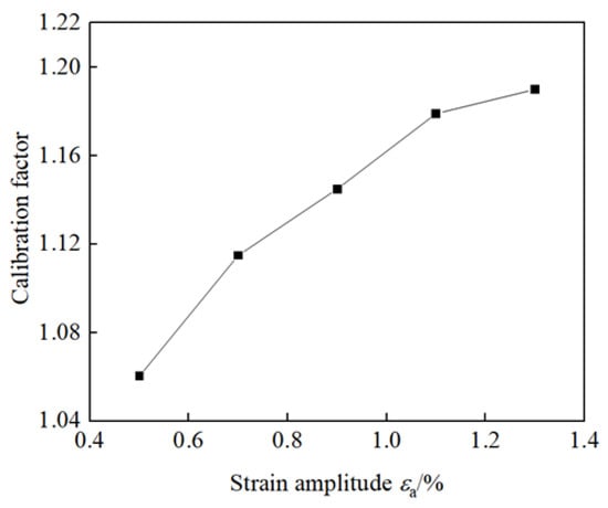 It is known that the measurement accuracy of the ferrite measuring instrument is affected by the geometric size of the specimen and mechanical load. In this paper, the Fisher FMP30 ferrite measuring instrument is used based on the principle of magnetic induction to accurately measure the ferromagnetic content in the sample by measuring the induced voltage. Ferrite in TRIP duplex stainless steel is ferromagnetic, and the martensite produced by phase transformation also has ferromagnetism. Therefore, by measuring the change in ferromagnetic content with a ferrite measuring instrument, the transformation amount of the phase martensite can be obtained [36]. Talonen J et al. [37] studied the measurement methods of martensite content, including magnetic induction method, X-ray diffraction method and optical metallographic method, etc., and found that there was a linear relationship between the martensite content measured by the magnetic induction method and the true content. The accurate transformation amount of martensite can be obtained by calibrating the measured values of the Fisher FMP30 ferrite measuring instrument. In this study, based on the structural form and size of the sample, this procedure was repeated for each strain amplitude using specimens of identical geometry to eliminate dimensional effects. The difference between pre- and post-holding values allowed for correction of magnetic measurement distortions induced by residual stresses. And in accordance with the calibration factors given in the “Fisher FMP30 Ferrite Measuring Instrument User Manual”, calibration was performed multiple times to ensure repeatability and consistency, the calibration factors of the martensite transformation amount in this experiment were determined, the value of 1.16 is taken as the calibration factor in this test. In addition, different calibration factors of mechanical load are needed for different strain amplitudes. In this study, the calibration factors of various strain amplitudes were obtained by the measured values of specimens with different strain amplitudes before and after holding (not loaded), as shown in Figure 5. In this study, the volume fraction of martensite was measured under symmetrical strain cyclic loading with strain amplitudes of 0.5%, 0.7%, 0.9%, 1.1%, and 1.3%. The selected strain amplitudes ranging from 0.5% to 1.3% were chosen to cover the typical range of cyclic deformation observed in TRIP steels under practical loading conditions. Strain amplitudes below 0.5% are generally insufficient to induce significant martensitic transformation, while amplitudes above 1.3% may lead to excessive plastic deformation or failure in the material. This range allows for the investigation of the gradual evolution of martensitic transformation with increasing strain amplitude, providing a comprehensive understanding of the material’s mechanical response and phase transformation behavior under cyclic loading. The measured ferrite content, which reflects the volume fraction of strain-induced martensite, is influenced by both the geometry of the specimen and the mechanical loading state. As the strain amplitude increases, the applied stress and strain energy density during cyclic loading also rise, leading to enhanced magnetic permeability changes in the transformed regions. This necessitates the use of specific calibration factors for different strain amplitudes to correct for magnetic field distortion caused by mechanical stress.