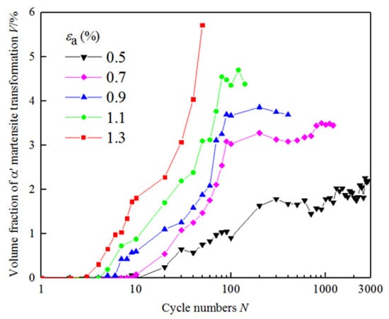 Figure 6 shows the curve of martensitic transformation of the experimental steel with cycles, which is under different strain amplitudes. The results show that the martensitic transformation under cyclic loading of the experimental steel has the following characteristics: under cyclic loading, martensitic transformation of metastable austenite occurs even at a low strain amplitude of 0.5%. The metastable austenite does not completely transform into martensite under the cyclic loading, and most metastable austenite is retained. The martensitic transformation increases with the increase in strain amplitude at the same cycle. The larger the strain amplitude is, the earlier the martensitic transformation occurs. In the end, the transformation tends to saturation with cycles, and the martensitic transformation mainly occurs in the initial 100 cycles.