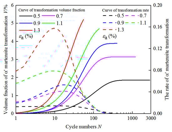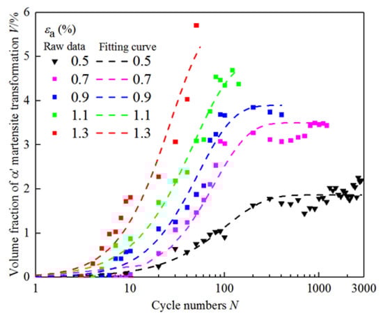The curves of the above kinetics model under different strain amplitudes are shown in Figure 7. Compared with previous studies on transformation kinetics in TRIP steels under cyclic loading, the proposed model achieves comparable or superior prediction accuracy. For example, Smaga et al. [22] reported transformation prediction errors within 10% for AISI 304 under low-cycle fatigue, while Tomita et al. [20] applied the TI model to carbon steel with a lower strain range. Our model, combining TI and Smaga formulations, achieves over 90% correlation with measured values across a broader strain amplitude range (0.5% to 1.3%), demonstrating better generalizability and reliability for Mn–N alloyed duplex stainless steels. This confirms the applicability of the proposed model to multi-phase TRIP systems beyond single-phase austenitic steels.