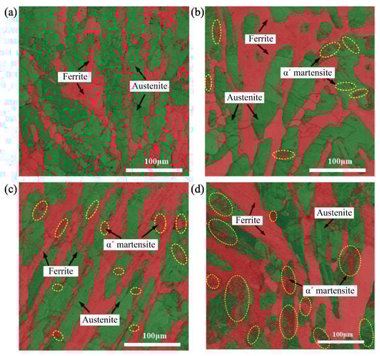 In Figure 9, the ferrite and the martensite are both BCC and so both are marked in red. The martensite is produced by austenite, which is in the austenite. It can be seen from the figure that the strain-induced martensite is in the shape of a sieve, as shown in the yellow dotted line in Figure 9. It can be seen from Figure 9b that only a small portion of austenite grains can produce martensite at the 15th cycle, which indicates that the austenite has poor stability and is easy to transform into martensite, but it has a low volume fraction. According to Figure 8, the volume fraction and the rate of martensitic transformation change with cycles, and the volume fraction of martensitic transformation is less in the range of 0–15 cycles. But the transformation rate increases rapidly, and it reaches the peak at the 15th cycle; martensite still increases with the increase in cycles (N > 15C). Compared with the EBSD diagram at the 15th cycle, the EBSD diagram at the 50th cycle shows that the amount of martensite increased. The martensite is flaky, and the austenite tends to be sieve-like. This phenomenon is more obvious in the fatigued specimen. According to Figure 8, the rate of martensitic transformation gradually decreases after 15 cycles, but the volume fraction of martensite still increases gradually and reaches the maximum at fatigue. The transformation rate drops to zero at the same time.