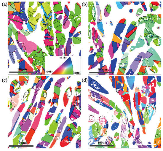 EBSD analysis diagram under different cycles showing. (a) Initial stage. (b) The 15th cycle. (c) The 50th cycle. (d) Fatigue state at the 150th cycle. As the cycle period increases continuously, the circled part in the figure keeps changing.