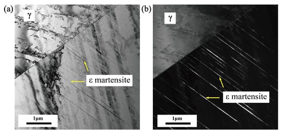 Figure 12 shows the microstructure of the experimental steel at the fifth cycle. The deformed band structure running through the whole austenite grain is parallel distributed in the austenite, which is white in the dark field diagram, indicating that these structures are different from the structure of the matrix, and they are the newly formed phase. According to the relevant literature, martensite is a thin strip, so it can be inferred that the fine strip structure is martensite. Compared with the original state, austenite grains produce phase transformation and martensite. In addition, compared with the TEM diagram of the original state in Figure 11, the stacking fault density is also significantly reduced. This is because the winding and superposition of the stacking fault is the intermediate step of transformation from austenite to martensite, and the density of the stacking fault decreases due to the formation of martensite [39].