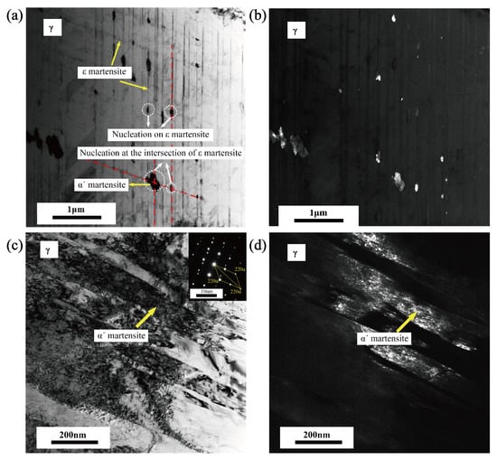 Figure 13 presents the bright-field and dark-field transmission electron microscopy (TEM) images of the austenite microstructure after cyclic loading, revealing the microscopic features of martensitic transformation. It can be seen from Figure 13a,b that, in addition to the strip structures ( martensite), there are also block structures in austenite. The comparison between the bright and dark field diagrams shows that the strip structures are different from the block structures. Consequently, it can be inferred that the block structures are martensite. In addition, it can be seen from the figure that a portion of martensite is produced at the intersection of martensite, and the other portion produced on martensite. Figure 13c,d are the bright and dark field diagrams of austenite at another location. The lamellar structure in austenite grain can be identified as martensite by diffraction pattern, which means the martensite is the martensitic transformation that is produced in austenite grain. Based on these microstructural observations, three distinct microscopic mechanisms for martensitic transformation under cyclic loading can be established: (1) A sequential transformation where austenite first transforms into martensite, and then martensite nucleates at the intersection of martensite plates. (2) A similar → → pathway, with martensite nucleating on the surface or boundary of martensite. (3) A direct → transformation that occurs independently within the austenite grain, driven by strain localization and high dislocation density induced by cyclic deformation. These results indicate that cyclic loading promotes multiple martensitic transformation pathways, depending on the local microstructural stress state, slip activity, and martensite distribution. The co-existence of these mechanisms highlights the complex interplay between metastable austenite stability, deformation-induced defects, and interphase interactions during fatigue loading.