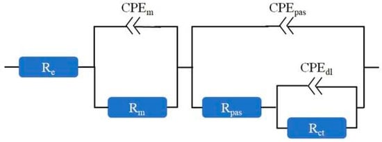 After 28 days of curing in a climatic chamber (T = 20 ± 2 °C, RH = 90 ± 10%), reinforced mortars were placed in a measuring container filled with distilled water for 24 h. After this time, electrochemical impedance spectroscopy (EIS) measurement was carried out, followed by the measurement of the polarization curve of the steel reinforcement. These measurements were performed using the Autolab PGSTAT 302N potentiostat/galvanostat with Nova 2.1.6 software. The measurements were conducted in a three-electrode arrangement, in which the mortar reinforcement served as the working electrode. As a reference electrode, a saturated calomel electrode (SCE) was used. The counter electrode was a stainless-steel plate. EIS measurements were carried out at a corrosion potential in the frequency range of 50 kHz–3 mHz. The amplitude of the sinusoidal excitation signal was 10 mV. The obtained impedance spectra were analyzed using an electrical equivalent circuit presented in Figure 2. The circuit is an equivalent circuit as in the work [36] but without the Warburg (diffusional) impedance (W). The Warburg impedance was removed because the impedance spectra obtained did not indicate the presence of diffusion processes.