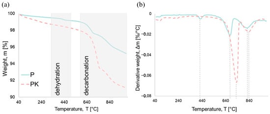 (a) TGA curves of calcareous fly ash (P—non-carbonated, PK—carbonated); (b) DTA curves of calcareous fly ash (peak temperatures are highlighted with dashed lines).