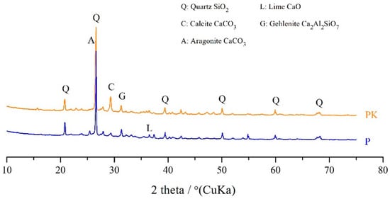Figure 4 shows the XRD spectra of the calcareous fly ash before and after CO2 sequestration. The main crystalline mineral phases detected in the non-carbonated fly ash (P) were quartz (SiO2), lime (CaO), calcite (CaCO3), and brucite (Mg(OH)2). The presence of calcite in the conventional coal fly ash could be due to the surface reaction of carbon dioxide in air with calcium hydroxide during the storage of the ash [48]. The carbonated calcareous fly ash (PK) showed a higher concentration of calcite (appears at 2θ = 29°) compared to the raw ash (P), which is due to the carbonation process of fly ash, which effectively absorbs CO2 and generates stable CaCO3 [49,50,51,52].