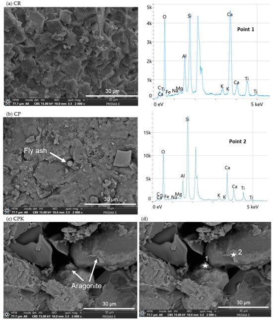 SEM of the concrete specimens (a) CR—reference concrete, (b) CP—concrete with non-carbonated calcareous fly ash, (c) CPK—concrete with carbonated calcareous fly ash, and (d) EDS from concrete with carbonated calcareous fly ash (CPK).