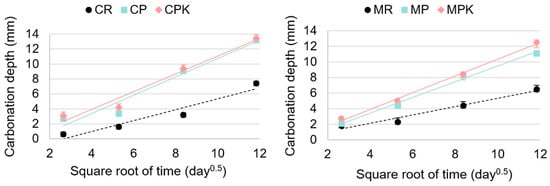 where dk (mm) is mean carbonation depth at time t (days), a (mm) is a constant representing the y-axis intercept, and KAC (mm·day−0.5) is the carbonation rate [35].