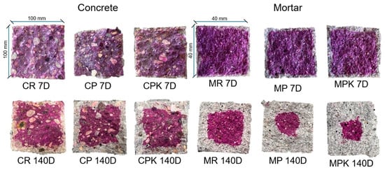 Three concrete prisms and three mortar beams of each composition were cast and cured for 28 days in accordance with PN-EN 12390-2 [33]. The test specimens were conditioned in a laboratory air environment for 14 days and then placed into the carbonation chamber with a temperature of 21 ± 2 °C, RH 60 ± 10%, and 3% CO2 according to PN-EN 12390-12 [34]. One prism and beam of each composition was taken out of the carbonation chamber after 7, 28, 70, and 140 days of exposure. Right after the designated storage duration, the specimens were split, and the cross section was sprayed with a phenolphthalein solution. The depth of carbonation was measured at 12 locations on each concrete or mortar sample. In areas where carbonation did not affect the specimen (pH ranging from above 9.3), the indicator turned pink, while the carbonated surface remained uncolored. The outcomes were graphed against the square root of time, and the carbonation rate was determined by calculating the slope of the fitted line using the following equation, Equation (3):