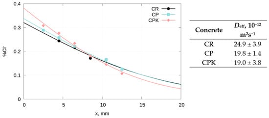 The chloride ion diffusion tests were carried out on 150 × 150 × 150 mm concrete cubes. After 28 days of curing in water, the samples were cut in half. The cutting surface was perpendicular to the top surface of the samples relative to their original molded orientation. All the surfaces of the sample, except for the surface created by the cutting of the sample, were sealed with paraffin. The prepared samples were placed in a 3% NaCl solution. Chlorides penetrated into the sample through one unsealed paraffin surface (the ‘cut’ surface). After 55 days, the concrete cubes were removed from the NaCl solution, their surfaces were dried with a paper towel, and concrete samples were taken using a Profile Grinder kit. Samples for quantitative analysis of chloride ions were taken from the surface formed by cutting the cubes. The thickness of the collected layers of concrete samples was 1 mm. The collected material was dried at 105 °C, and its chloride ion content was determined using the Volhard method. The concrete samples were dissolved in water solution of nitric acid. The results obtained by this method represent the total chloride content, including both free and bound chlorides. For each composition of concrete, the test was performed on both halves of a split concrete cube. The chloride content in untreated concrete (ci) was also determined. The obtained distribution of chloride content in concrete was fitted to Equation (5) to determine the effective diffusion coefficient Deff of chloride ions in concrete.