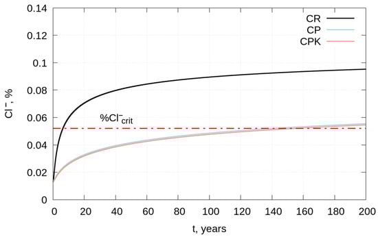 Chlorides penetrating into concrete cause a risk of corrosion of reinforcement, which limits the service life of reinforced concrete structures. Based on the obtained Deff values (point 2.4.5), it is possible to estimate the service life of a structure made of such concrete exposed to chloride ions. It is important to also consider the effect of the structure’s ambient temperature on Deff and the fact that Deff decreases over time. The slower diffusion of chloride in older concrete is related to the sealing the concrete microstructure due to binder hydration and the binding of chloride ions into salts that crystallize with increasing volume [37,38]. The diffusion coefficient Deff at any time can be estimated from Equation (6):