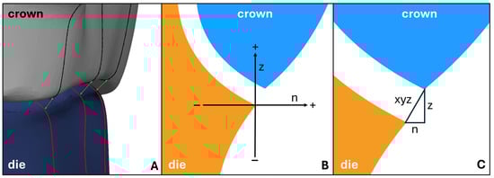 Within the two-dimensional cross-sectional analysis, which was also carried out using the software ATOS Professional (Carl Zeiss GOM Metrology GmbH), the linear discrepancies between the crown margin and the preparation margin were recorded with the help of pre-programmed analysis scripts. The program generated 20 radial sections at 18° intervals, starting from the center of the crown or die. For each section, three distances were calculated according to the classification by Holmes et al. [38]: the “z” distance along the vertical z-axis of the coordinate system (vertical marginal discrepancy), the “n” distance in the horizontal plane (horizontal marginal discrepancy), and the “xyz” distance as the absolute linear distance between the crown margin and the preparation margin (absolute marginal discrepancy), as illustrated in Figure 1.