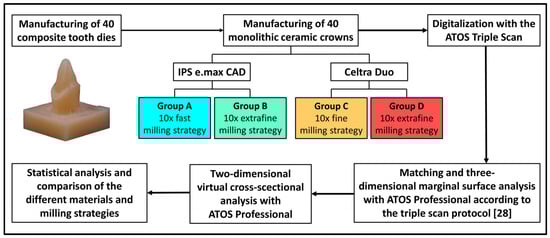 The aim of the present in vitro study was, therefore, to investigate the influence of different milling strategies on the marginal fit of CAD/CAM-fabricated monolithic lithium disilicate crowns made of IPS e.max CAD and Celtra Duo. The null hypotheses were that neither the milling strategy nor the selected restorative material had an influence on the accuracy of fit.