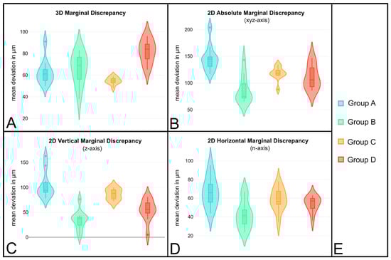 Figure 3. Violin plots showing the mean distance in μm for all groups (E) for the three-dimensional marginal discrepancy (A) and the two-dimensional absolute marginal discrepancy (B), as well as the vertical (C) and horizontal (D) marginal discrepancies.