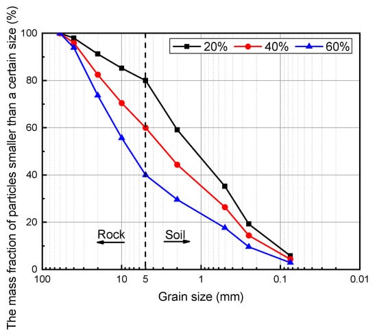 The soil and rock threshold was the boundary of the particle size of “soil” and “rock” in the soil–rock mixture, which was an essential physical property index reflecting the scale independence of the soil–rock mixture. According to the Standard for Geotechnical Test Methods (GB/T50123–2019) [32], 5 mm was selected as the soil and rock threshold, and the maximum particle size of the rock was not more than 60 mm. P5 indicates the size of the rock content in the backfill of the soil–rock mixture [33].