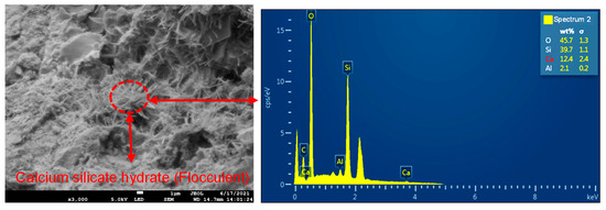 - The calcium silicate hydrate showed a fiber-like and flocculent, sparse distribution in the vicinity of voids and minute fractures;