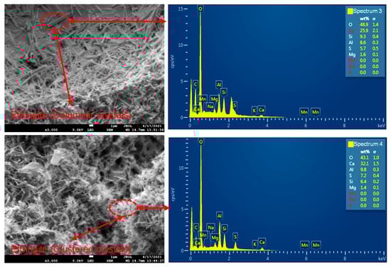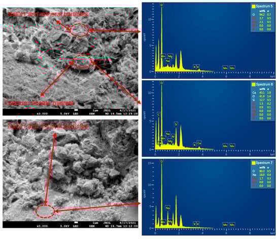 The macroscopic mechanical properties of SRM–SC are inextricably linked to their internal microstructures. To compare and analyze the cementation ability and cementation mechanism of different slurry–soil–rock mixtures, scanning electron microscopy (SEM) equipped with energy dispersive X–ray spectroscopy (EDX) was used to analyze the surface morphology and composition of typical debris specimens after macromechanical property tests.