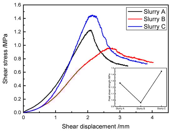 The shear stress–shear displacement curves of the typical specimens of SRM–SC reinforced with different types of slurries are shown in Figure 11. The data in Figure 11 show that the corresponding shear strengths were 1.27 MPa, 0.96 MPa, and 1.45 MPa under the cementation conditions of slurry A, slurry B and slurry C, and the peak shear displacements were 2.08 mm, 2.76 mm, and 1.64 mm, respectively, and the corresponding shear moduli were 0.61 GPa, 0.35 GPa, and 0.88 GPa, respectively.