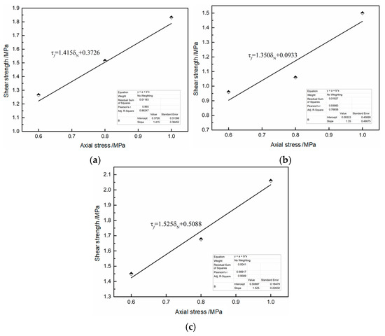 It can be concluded that the axial pressure was an important factor affecting the shear mechanical properties of the SRM–SC. With the increase in the axial pressure, the shear strength and the shear stiffness of the SRM–SC also increased. As mentioned earlier, the relationship between the shear strength of the SRM–SC and the axial stress was verified to align with the Mohr–Coulomb criterion. That is, increasing the axial pressure can enhance the ability of SRM–SC to resist deformation and damage, and the reasons for this were analyzed as follows: on the one hand, the axial pressure can play a role in compacting the original tiny voids and fractures within the range of not exceeding the uniaxial compressive strength of the SRM–SC specimen, which improves the continuity of the internal structure of the SRM–SC specimen; on the other hand, increasing the axial stress can enhance the friction effect between the particles inside the SRM–SC specimen, and the maximum static friction at the shear position increases, at which time it is necessary to provide larger shear stress to overcome the frictional resistance, thus indirectly enhancing the shear strength and shear modulus of the SRM–SC.