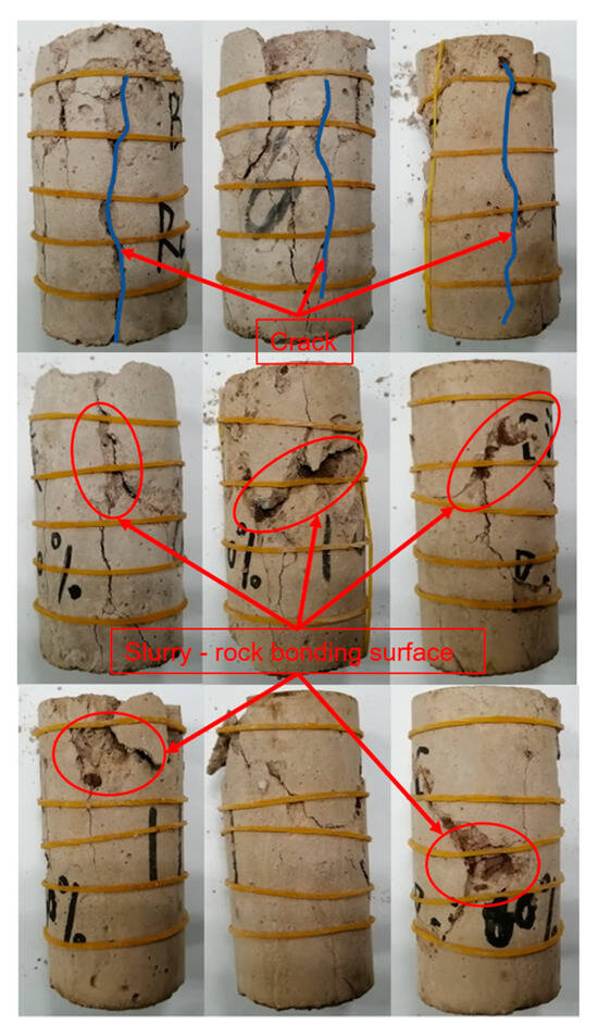 - The SRM–SC basically conforms to the Mohr–Coulomb criterion in the range of axial stress 0.6 MPa~1.0 MPa. The damage mode of the shear surface was divided into three categories: the direct shearing of rock, the detachment of the rock and slurry cementation surface, and the direct shearing of pure slurry liquid. The damage mode is related to the axial pressure level; when the axial pressure level is higher, it is dominated by the shearing of the rock and pure slurry liquid, and when the axial pressure level is less, it is dominated by the detachment of the rock and slurry cementation surface.