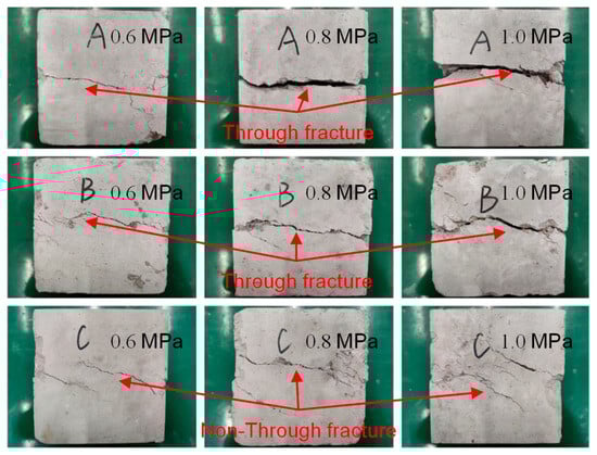 The tests considered the effects of the slurry type, rock content, and axial pressure on the mechanical properties of SRM–SC, and the test programs shown in Table 5 and Table 6 were formulated. Specimens 1–9 were designed to study the effects of using different types of slurry injection reinforcement and different axial pressures on the shear strength of SRM–SC. The types of slurry were an ordinary Portland cement single-liquid slurry; a low-alkalinity sulfoaluminate cement single-liquid slurry; and an ordinary Portland cement–water–glass double-liquid slurry (the volume ratio of cement to water–glass was 1:1), and the slurry water–cement ratios were all 1:1, starting now referred to as slurry A, slurry B, and slurry C, respectively. Specimens 10–11 were used to study the effect of the rock content on the shear strength of SRM–SC, and the rock content in the field ranged from 20% to 50%, so the three levels of the rock content were taken as 20%, 40%, and 60%, respectively. The axial pressure levels of the shear test were taken as 0.6 MPa, 0.8 MPa, and 1.0 MPa, respectively. Specimens a–i were taken to study the effects of different types of slurry reinforcement and different rock contents on the compressive strength of the SRM–SC.