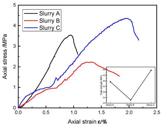 Under the condition of the same rock content of the SRM–SC specimens, the uniaxial compressive ultimate strength of the SRM–SC bonded with the ordinary Portland cement–water–glass slurry was the highest, followed by the SRM–SC specimens cemented with the ordinary Portland cement slurry, and the lowest was the SRM–SC specimens cemented with the low-alkalinity sulfoaluminate cement slurry. The uniaxial compressive ultimate strengths of the SRM–SC specimens formed by the three kinds of slurry cement were 3.54 MPa, 2.23 MPa, and 4.36 MPa at the 40% rock content.