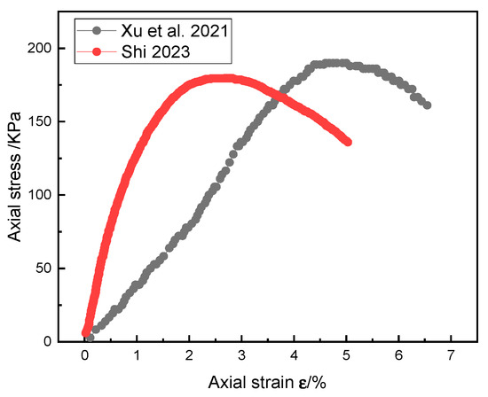 The axial stress–strain curve of the soil–rock mixture (rock content 40%) [34,35].