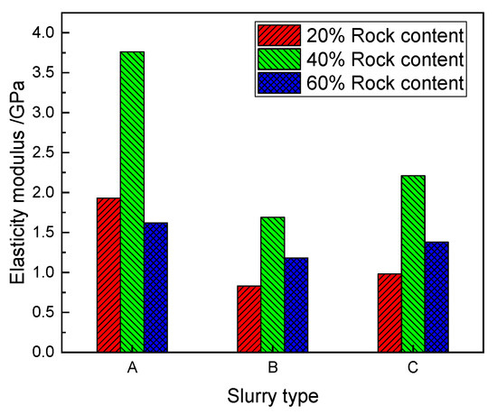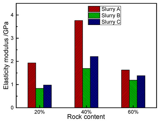 A comparison of the elasticity modulus of the SRM–SC under the different rock content conditions is shown in Figure 21: under the condition of using the same type of slurry cement, the elasticity moduli of the SRM–SC specimens with the 40% rock content were the highest, which were 3.76 GPa, 1.69 GPa, and 2.21 GPa, respectively; the elasticity moduli of the SRM–SC specimens with the 20% rock content were 1.93 GPa, 0.83 GPa, and 0.98 GPa; the elasticity moduli of the SRM–SC specimens with the 60% rock content were 1.62 GPa, 1.18 GPa, and 1.38 GPa, respectively.