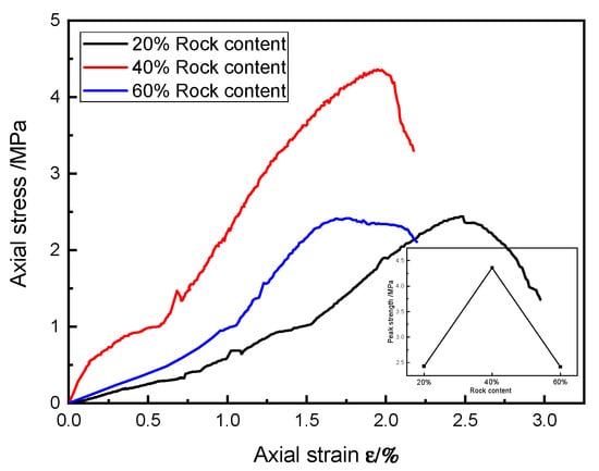 The stress–strain curves of the typical specimens of SRM–SC with different rock contents under uniaxial compression are shown in Figure 19. As seen from Figure 19, under the condition of using the same type of slurry cement, the SRM–SC with the 40% rock content had the highest uniaxial compressive ultimate strength, and the uniaxial compressive ultimate strengths of the SRM–SC specimens with the 20% rock content and the 60% rock content were relatively close to each other. The uniaxial compressive ultimate strength of the SRM–SC samples cemented with the ordinary Portland cement–water–glass slurry was 2.43 MPa, 4.36 MPa, and 2.42 MPa, respectively. It is evident that the uniaxial compressive ultimate strength of the SRM–SC exhibits a trend of initial enhancement followed by a decline with the increasing rock content, identifying an inflection point between the 20% and the 60% rock content. As depicted in Figure 20, the uniaxial compressive ultimate strength of the soil–rock mixture decreases monotonically with the rise in the rock content. This indicates that the grouting reinforcement induces alterations in the internal microstructure of the soil–rock mixture, consequently modifying its uniaxial compressive behavior.