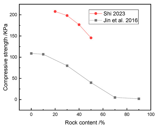 The influence of the rock content on the compressive strength of the soil–rock mixture [35,36].