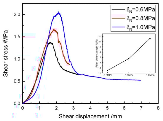 The shear stress–shear displacement curves of the typical specimens of SRM–SC under different axial pressure conditions are shown in Figure 22. The data in Figure 22 show that the corresponding shear strengths were 1.45 MPa, 1.68 MPa, and 2.06 MPa for axial pressures of 0.6 MPa, 0.8 MPa, and 1.0 MPa, respectively, the peak shear displacements were 1.64 mm, 1.86 mm, and 2.13 mm, respectively, and the corresponding shear moduli were 0.88 GPa, 0.90 GPa, and 0.97 GPa, respectively.