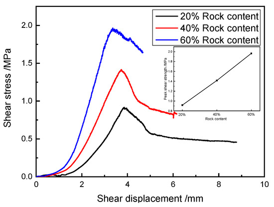The shear stress–shear displacement curves of the typical specimens of SRM–SC with different rock contents under direct shear conditions are shown in Figure 23. The data in Figure 23 show that the corresponding shear strengths of the SRM–SC specimens with 20%, 40%, and 60% rock contents were 0.92 MPa, 1.41 MPa, and 1.96 MPa, respectively, the peak shear displacements were 3.86 mm, 3.75 mm, and 3.36 mm, respectively, and the corresponding shear moduli were 0.24 GPa, 0.38 GPa, and 0.58 GPa, respectively.
