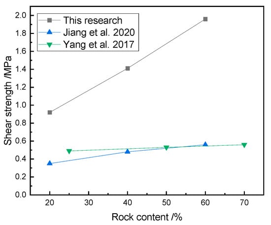Obviously, the rock content was an essential factor affecting the shear mechanical properties of the SRM–SC, and the shear strength and shear stiffness of the SRM–SC increased with the increasing rock content. The increased rock content contributes to the formation of a slurry–rock bonded framework on the shear plane and a higher density of rock particles, thereby elevating the resistance that must be overcome to induce shearing. On the other hand, with the increased rock content, the slurry–rock skeleton and the contact surface of the cemented soil mass increased, and the coupling and interlocking effect between the rocks and between the rocks and the slurry was also enhanced. This regularity is in agreement with the investigation into the shear behavior of soil–rock mixtures (refer to Figure 24), as the shear strength of rock–soil mixtures and SRM–SC both increase with the increase in rock content. The distinct difference lies in the fact that the rate of increase in the shear strength of the SRM–SC with the increasing rock content is significantly greater than that of the soil–rock mixtures. This suggests that the shear strength of the SRM–SC is more sensitive to changes in the rock content compared to that of the soil–rock mixtures.