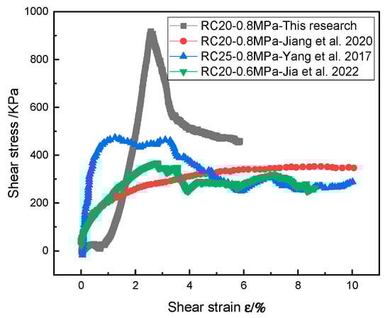 The shear stress–strain curve of the soil–rock mixture/SRM–SC (note: RC20-0.8 MPa represents a rock content of 20% and an axial pressure of 0.8 MPa) [37,38,39].